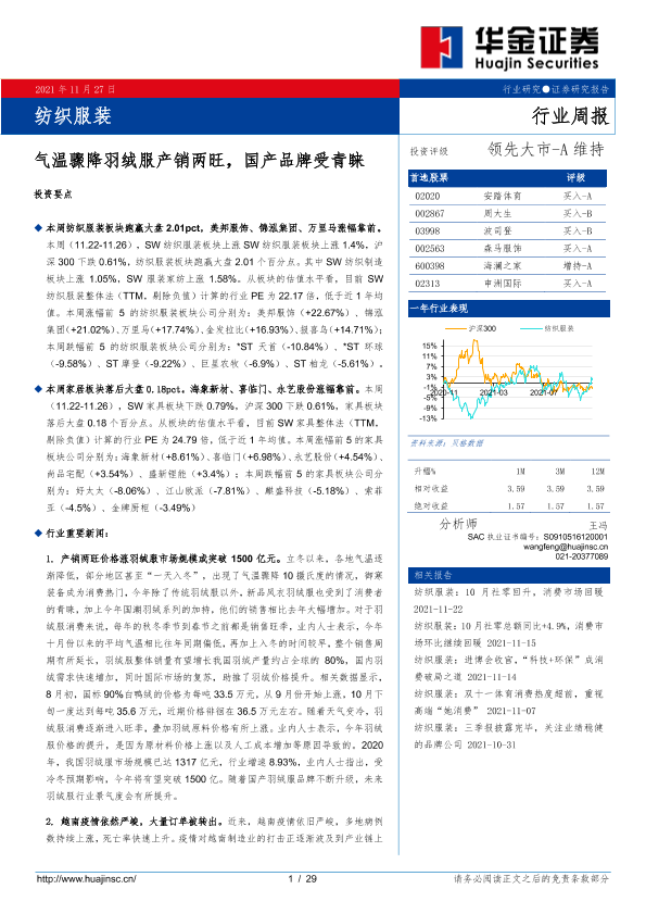 【华金证券】【20211127】20211127-华金证券-纺织服装行业周报:气温骤降羽绒服产销两旺,国产品牌受青睐-29页