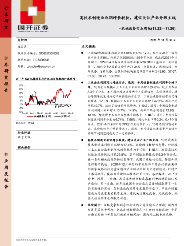 【国开证券】【20211130】20211130-国开证券-机械设备行业周报:高技术制造业利润增长较快,建议关注产业升级主线-9页