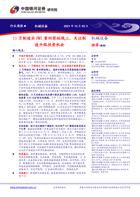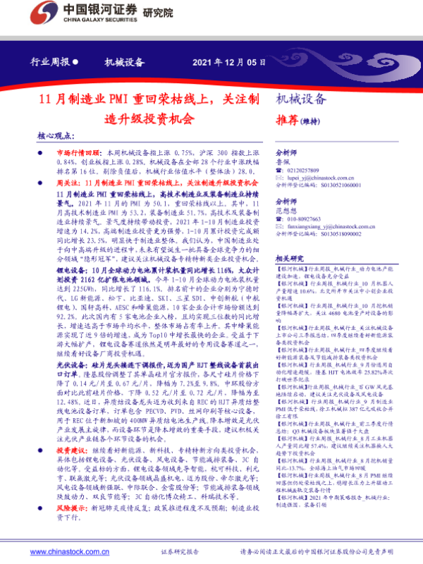 【银河证券】【20211205】20211205-中国银河-机械设备行业周报:11月制造业PMI重回荣枯线上,关注制造升级投资机会-16页