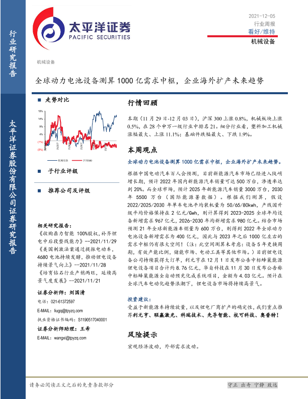 【太平洋证券】【20211205】20211205-太平洋-机械设备行业周报:全球动力电池设备测算1000亿需求中枢,企业海外扩产未来趋势-14页