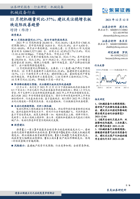 【东吴证券】【20211212】机械设备行业:11月挖机销量同比-37%,建议关注稳增长板块边际改善趋势-6页