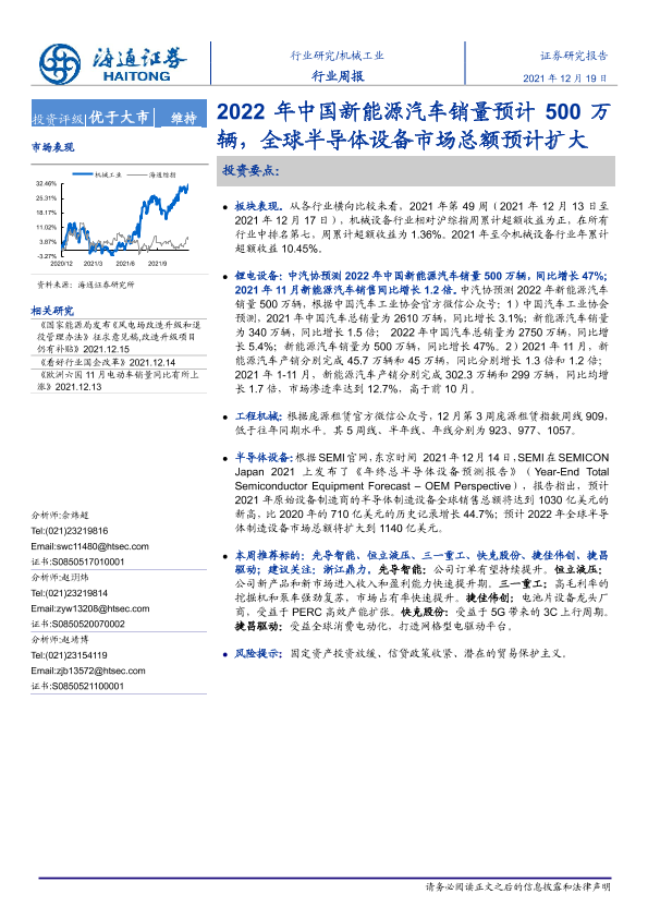 【海通证券】【20211219】20211219-海通证券-机械工业行业周报:2022年中国新能源汽车销量预计500万辆,全球半导体设备市场总额预计扩大-9页