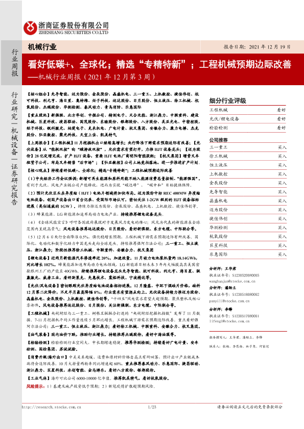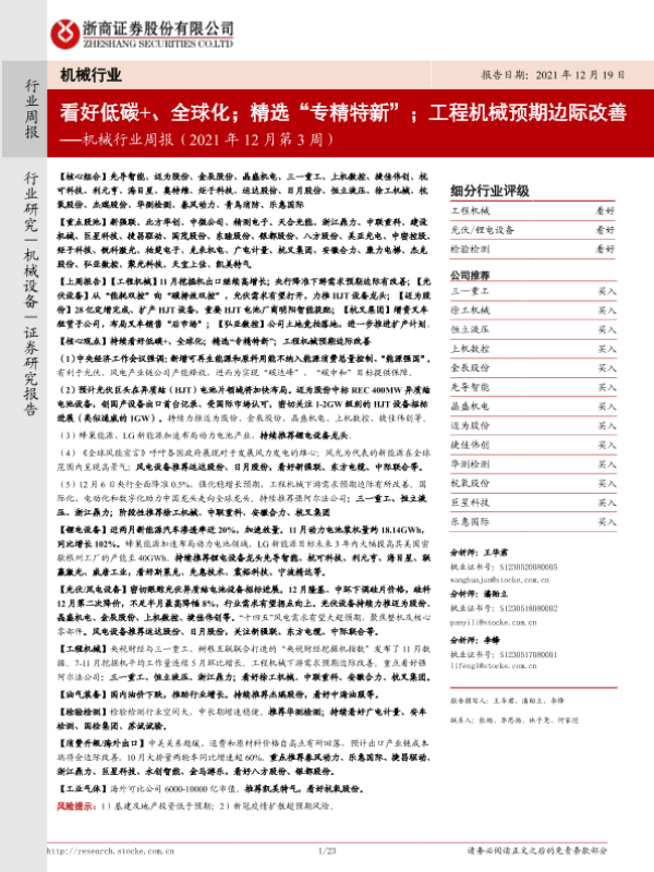 【浙商证券】【20211219】机械行业周报(2021年12月第3周):看好低碳+、全球化;精选“专精特新”,工程机械预期边际改善-23页