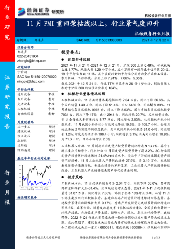 【渤海证券】【20211222】20211222-渤海证券-机械设备行业月报:11月PMI重回荣枯线以上,行业景气度回升-13页