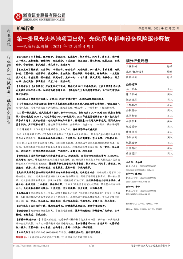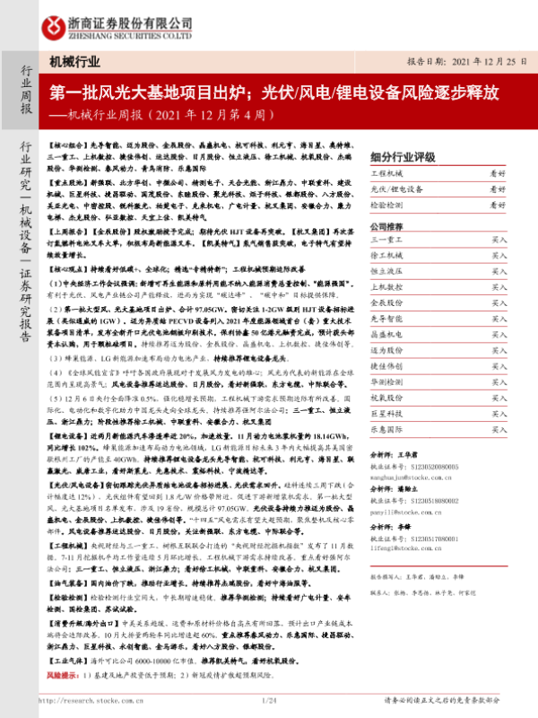 【浙商证券】【20211225】机械行业周报(2021年12月第4周):第一批风光大基地项目出炉;光伏 风电 锂电设备风险逐步释放-24页