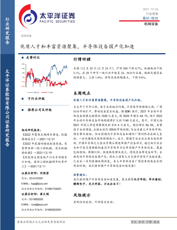 【太平洋证券】【20211226】机械设备行业周报:优质人才和丰富资源聚集,半导体设备国产化加速-15页