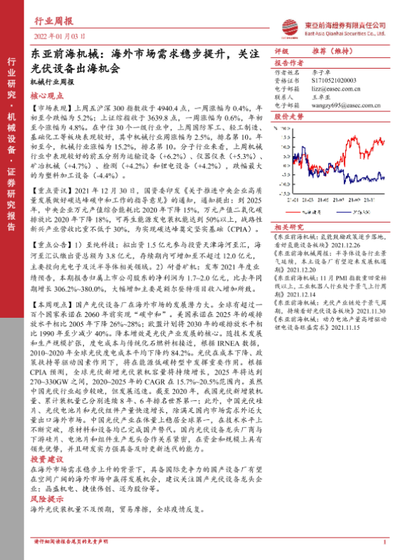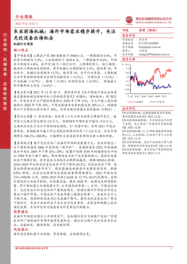 【东亚前海证券】【20220103】东亚前海机械行业周报:海外市场需求稳步提升,关注光伏设备出海机会-18页