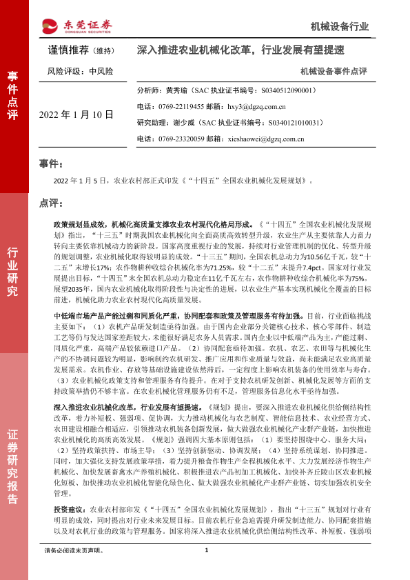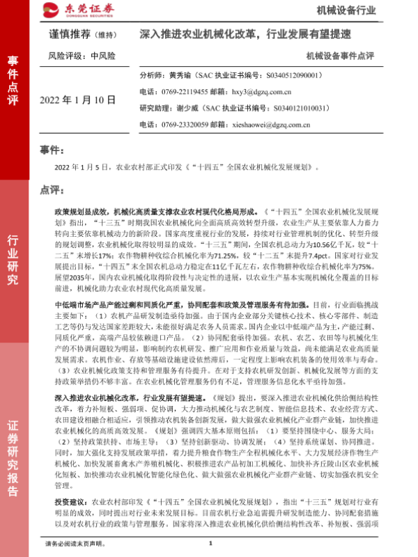 【东莞证券】【20220110】20220110-东莞证券-机械设备事件点评:深入推进农业机械化改革,行业发展有望提速-3页