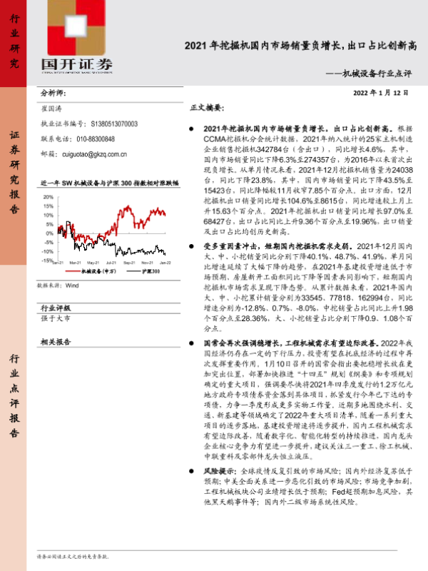 【国开证券】【20220112】20220112-国开证券-机械设备行业点评:2021年挖掘机国内市场销量负增长,出口占比创新高-4页
