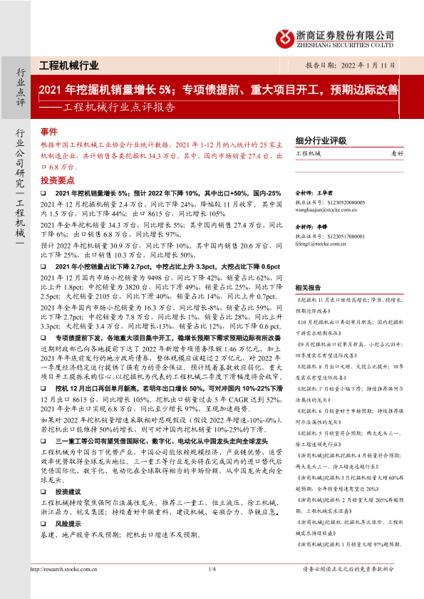【浙商证券】【20220111】20220111-浙商证券-工程机械行业点评报告:2021年挖掘机销量增长5%;专项债提前、重大项目开工,预期边际改善-4页