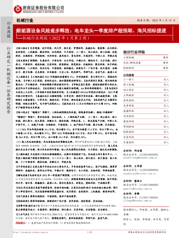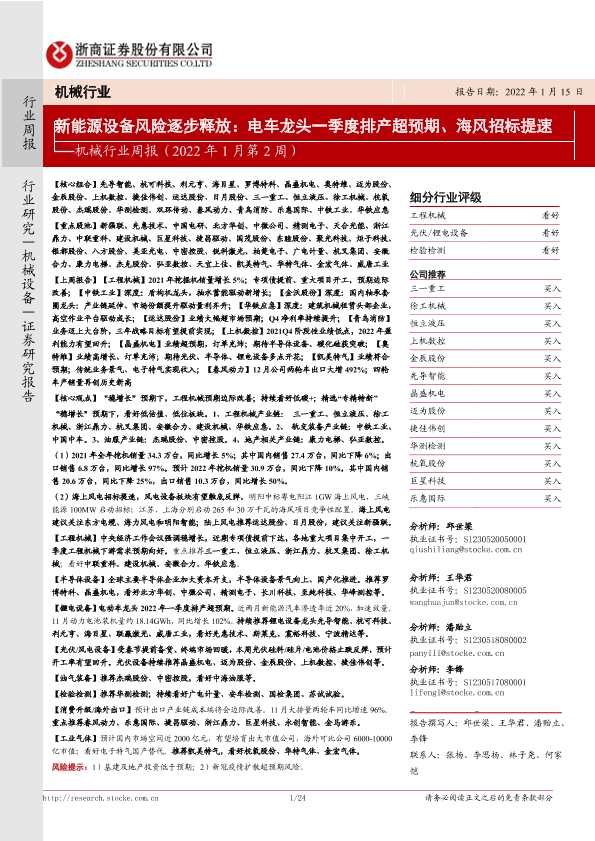 【浙商证券】【20220115】机械行业周报(2022年1月第2周):新能源设备风险逐步释放:电车龙头一季度排产超预期、海风招标提速-24页