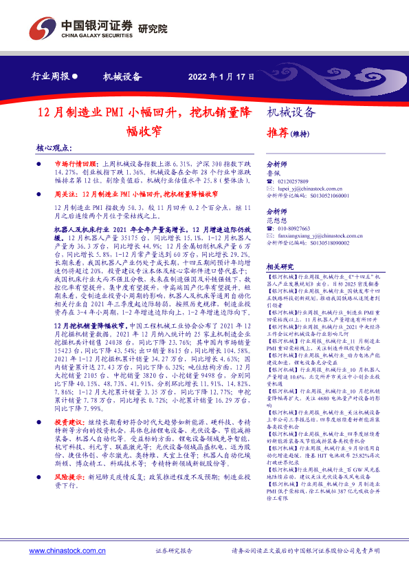【银河证券】【20220117】20220117-中国银河-机械设备行业周报:12月制造业PMI小幅回升,挖机销量降幅收窄-18页