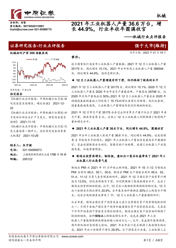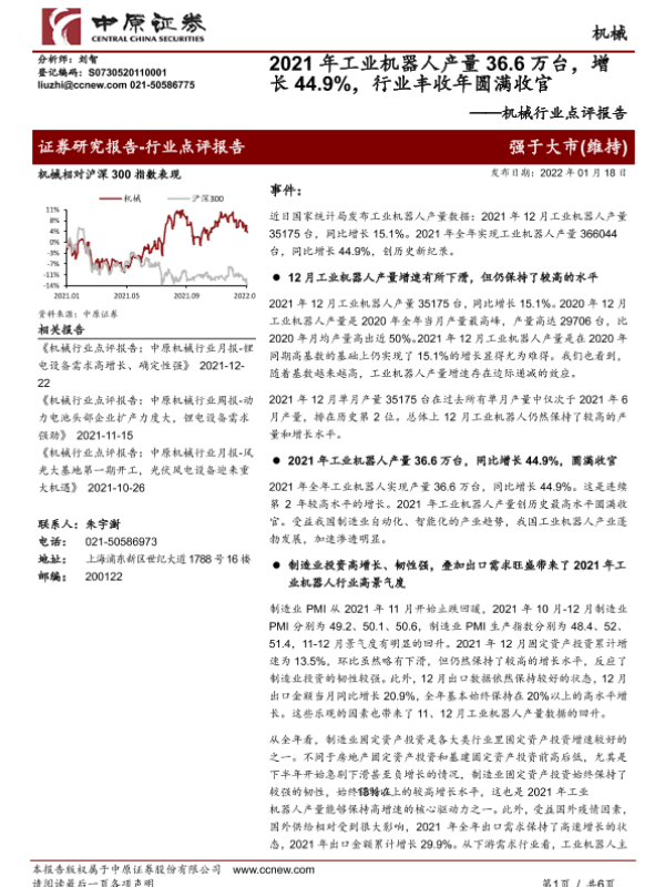 【中原证券】【20220118】20220118-中原证券-机械行业点评报告:2021年工业机器人产量36.6万台,增长44.9%,行业丰收年圆满收官-6页