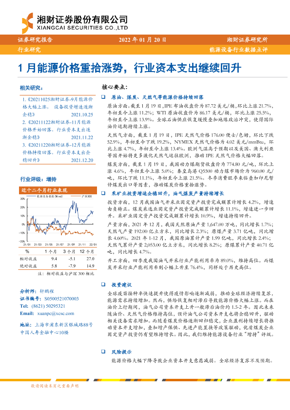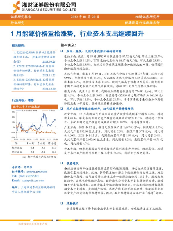 【湘财证券】【20220120】1月能源价格重拾涨势,行业资本支出继续回升-6页