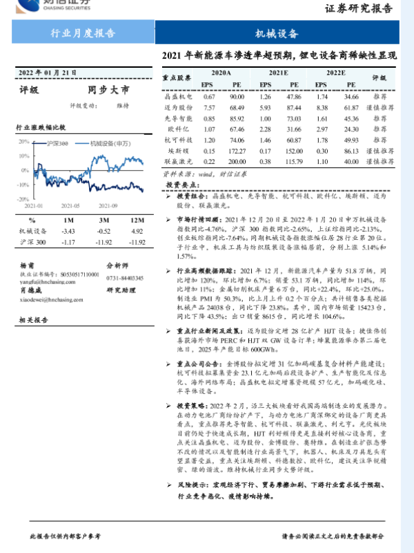 【财信证券】【20220121】20220121-财信证券-机械设备行业月度报告:2021年新能源车渗透率超预期,锂电设备商稀缺性显现-21页