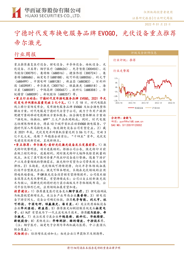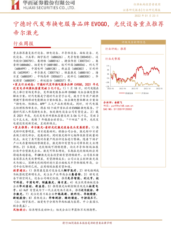 【华西证券】【20220123】20220123-华西证券-机械设备行业周报:宁德时代发布换电服务品牌EVOGO,光伏设备重点推荐帝尔激光-22页