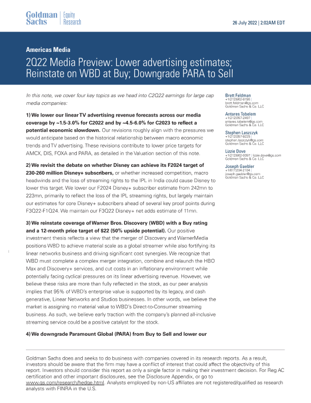 【Goldman Sachs】【20220726】2Q22 Media Preview Lower advertising estimates; Reinstate on WBD at Buy; Downgrade PARA to Sell-33页