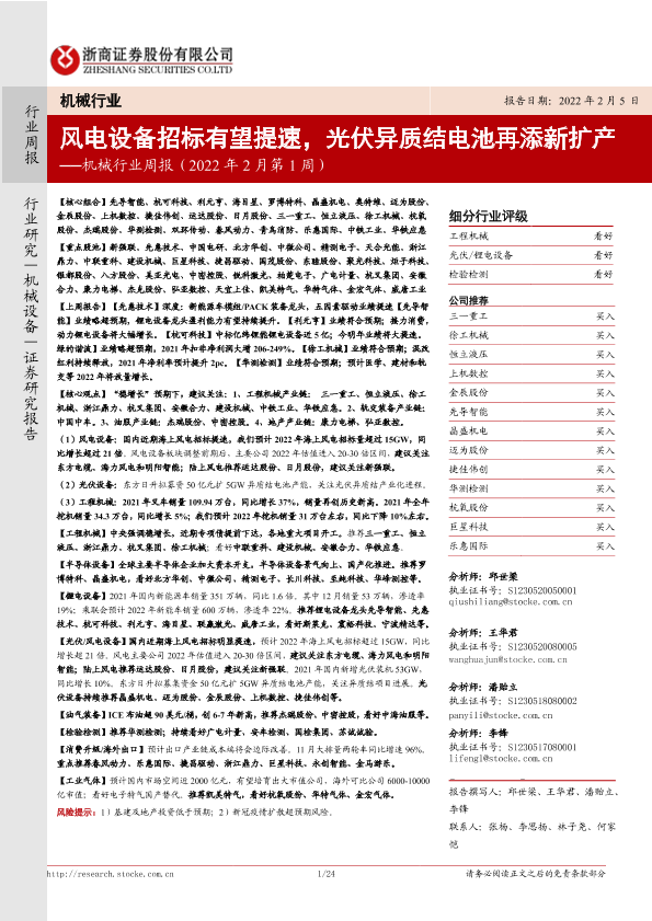 【浙商证券】【20220205】机械行业周报(2022年2月第1周):风电设备招标有望提速,光伏异质结电池再添新扩产-24页