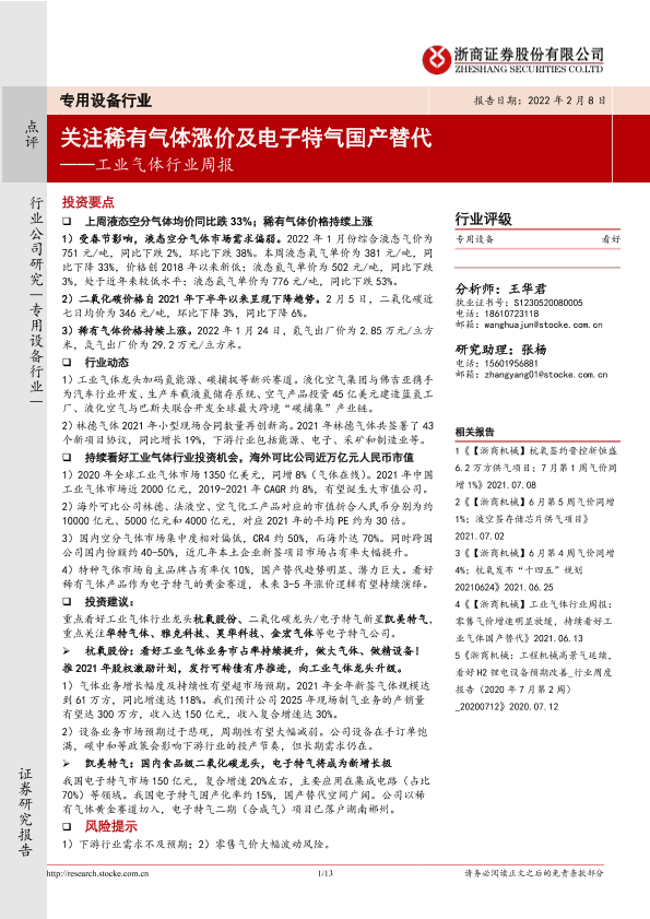 【浙商证券】【20220208】20220208-浙商证券-工业气体行业周报:关注稀有气体涨价及电子特气国产替代-13页