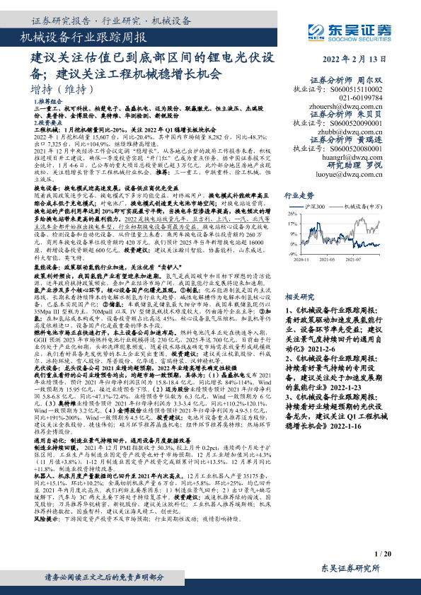 【东吴证券】【20220213】20220213-东吴证券-机械设备行业跟踪周报:建议关注估值已到底部区间的锂电光伏设备;建议关注工程机械稳增长机会-20页