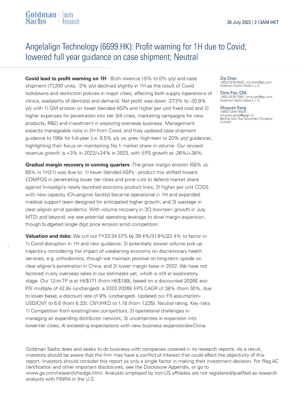 【Goldman Sachs】【20220726】Angelalign Technology(6699.HK) Profit warning for 1H due to Covid; lowered full year guidance on case shipment; Neutral-6页