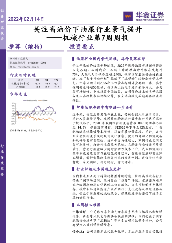 【华鑫证券】【20220214】机械行业第7周周报:关注高油价下油服行业景气提升-23页