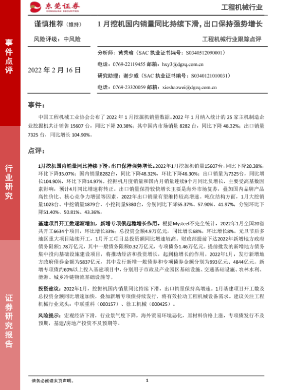 【东莞证券】【20220216】20220216-东莞证券-工程机械行业跟踪点评:1月挖机国内销量同比持续下滑,出口保持强势增长-3页