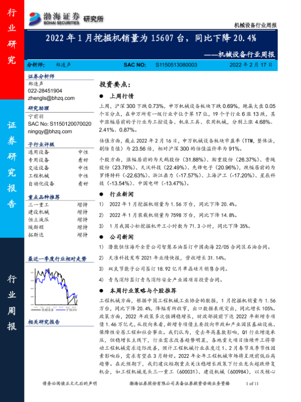 【渤海证券】【20220217】20220217-渤海证券-机械设备行业周报:2022年1月挖掘机销量为15607台,同比下降20.4%-11页
