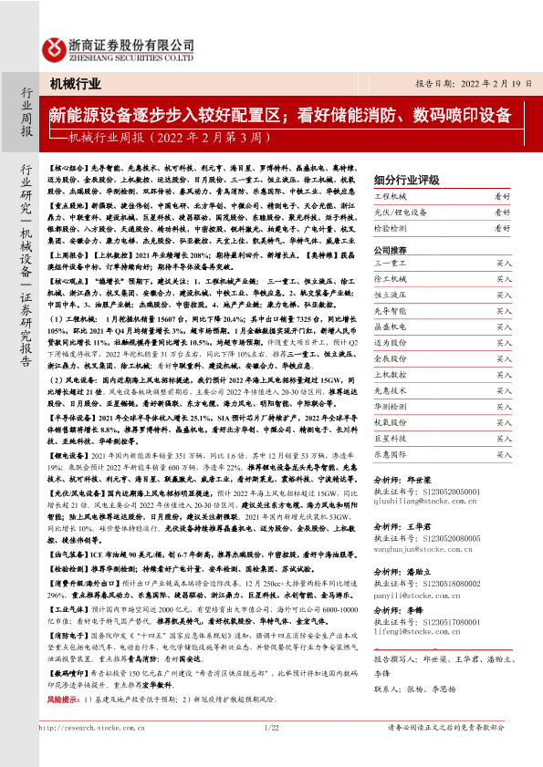 【浙商证券】【20220219】机械行业周报(2022年2月第3周):新能源设备逐步步入较好配置区;看好储能消防、数码喷印设备-22页