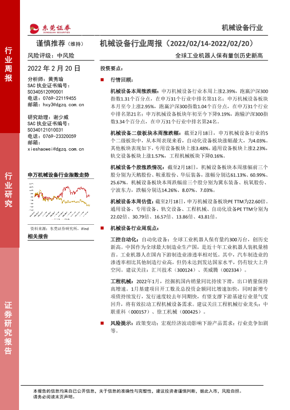 【东莞证券】【20220220】东莞证券-机械设备行业周报:全球工业机器人保有量创历史新高-11页
