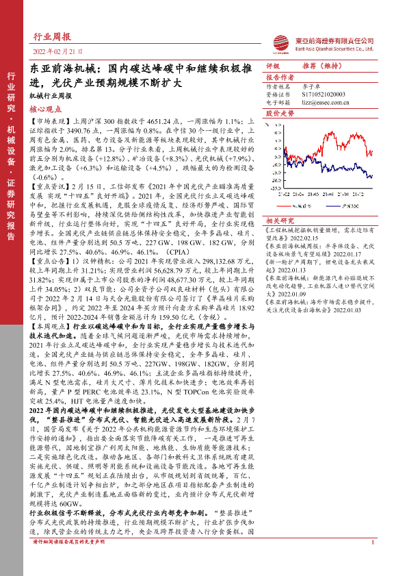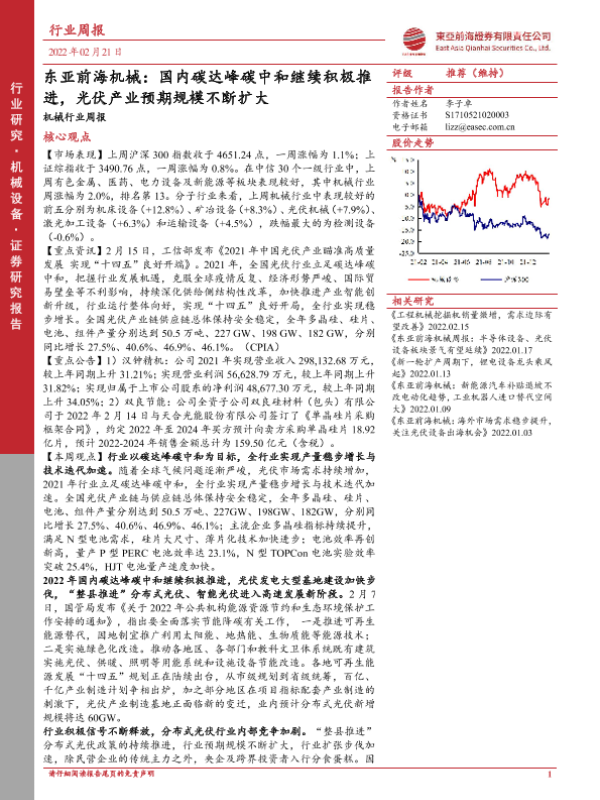 【东亚前海证券】【20220221】东亚前海机械:国内碳达峰碳中和继续积极推进,光伏产业预期规模不断扩大-18页