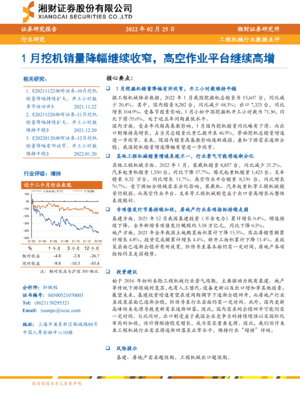 【湘财证券】【20220225】1月挖机销量降幅继续收窄,高空作业平台继续高增-10页