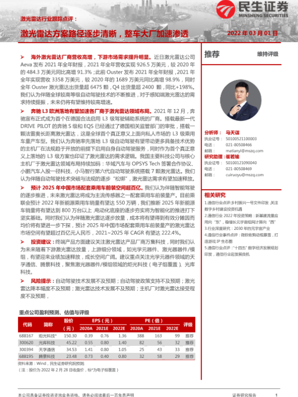 【民生证券】【20220301】激光雷达行业跟踪点评:激光雷达方案路径逐步清晰,整车大厂加速渗透-2页