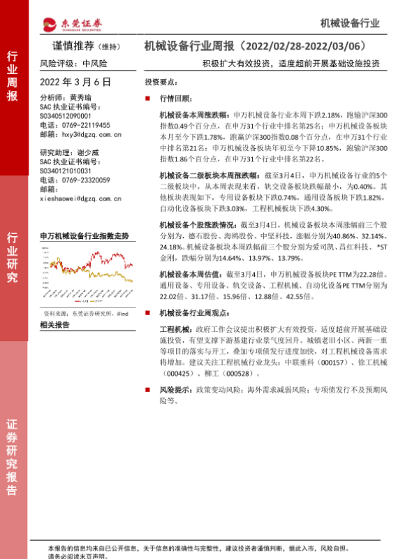 【东莞证券】【20220306】机械设备行业周报:积极扩大有效投资,适度超前开展基础设施投资-12页