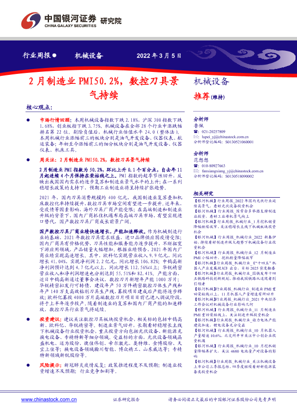 【银河证券】【20220305】20220305-中国银河-机械设备行业周报:2月制造业PMI50.2%,数控刀具景气持续-18页