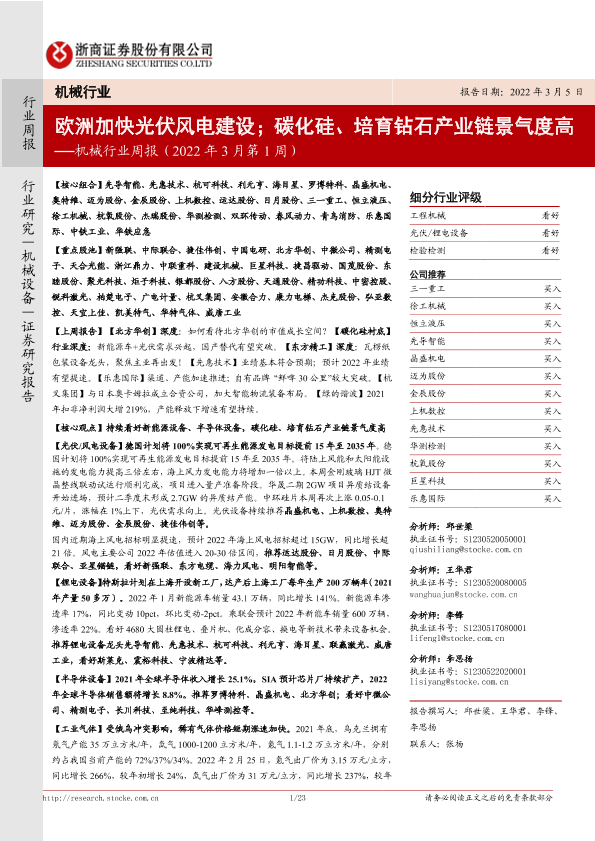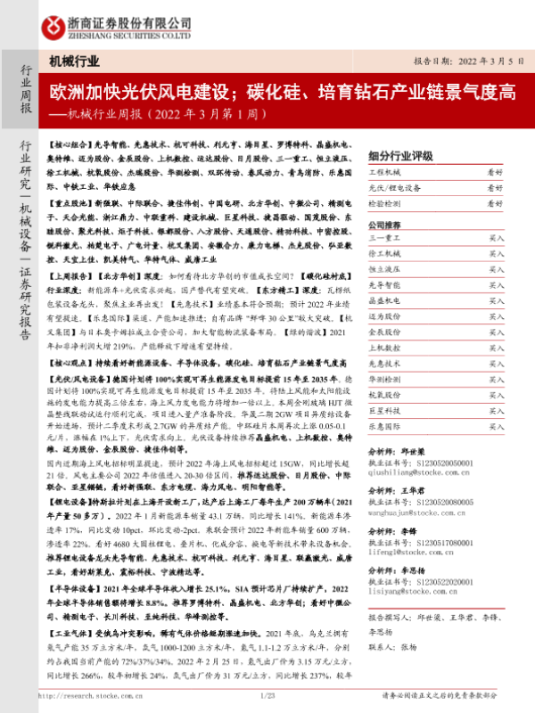 【浙商证券】【20220305】机械行业周报(2022年3月第1周):欧洲加快光伏风电建设;碳化硅、培育钻石产业链景气度高-23页