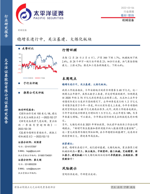 【太平洋证券】【20220306】20220306-太平洋-机械设备行业周报:稳增长进行中,关注基建、大炼化板块-16页