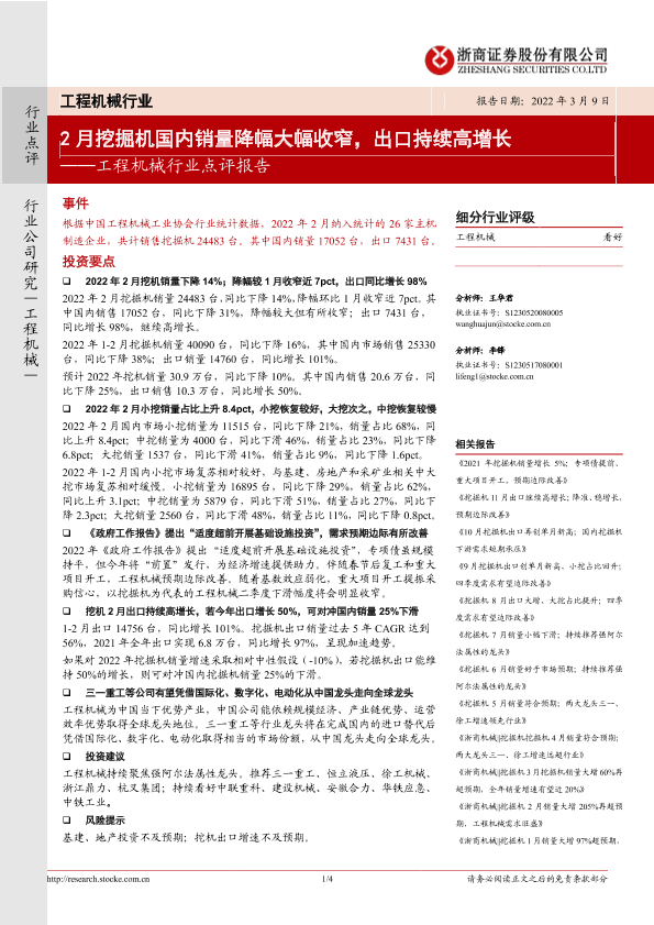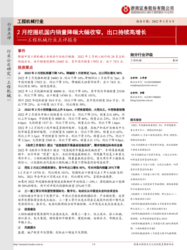 【浙商证券】【20220309】20220309-浙商证券-工程机械行业点评报告:2月挖掘机国内销量降幅大幅收窄,出口持续高增长-4页