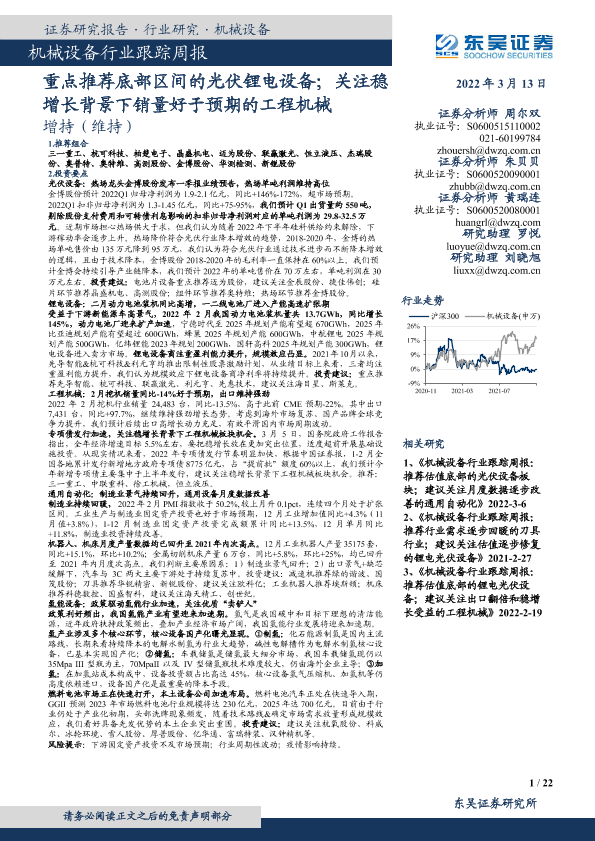 【东吴证券】【20220313】20220313-东吴证券-机械设备行业跟踪周报:重点推荐底部区间的光伏锂电设备;关注稳增长背景下销量好于预期的工程机械-22页