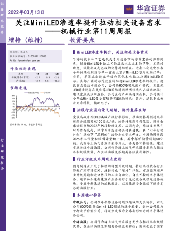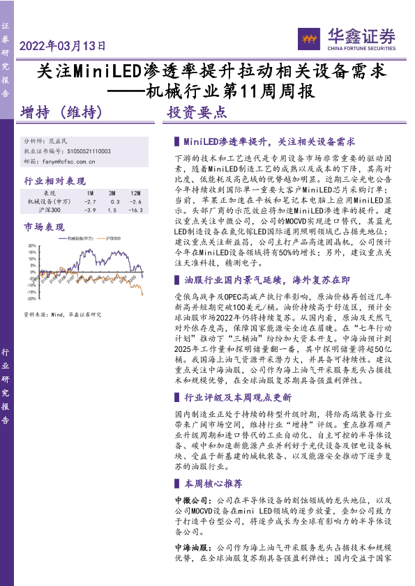 【华鑫证券】【20220313】机械行业第11周周报:关注MiniLED渗透率提升拉动相关设备需求-24页
