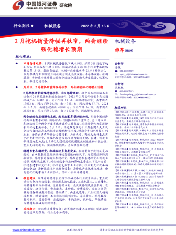 【银河证券】【20220313】20220313-中国银河-机械设备行业周报:2月挖机销量降幅再收窄,两会继续强化稳增长预期-18页