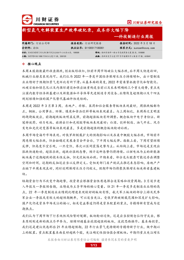 【川财证券】【20220318】20220318-川财证券-科技制造行业周报:新型氢气电解装置生产效率破纪录,成本亦大幅下降-13页