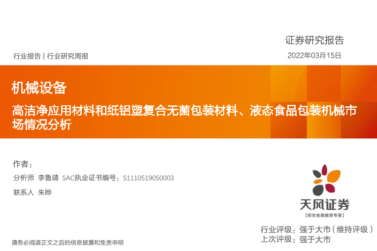 【天风证券】【20220315】20220315-天风证券-机械设备行业研究周报:高洁净应用材料和纸铝塑复合无菌包装材料、液态食品包装机械市场情况分析-18页