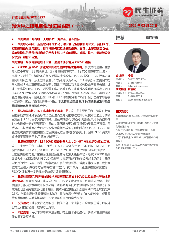 【民生证券】【20220327】机械行业周报:光伏异质结电池设备进展跟踪(一)-18页