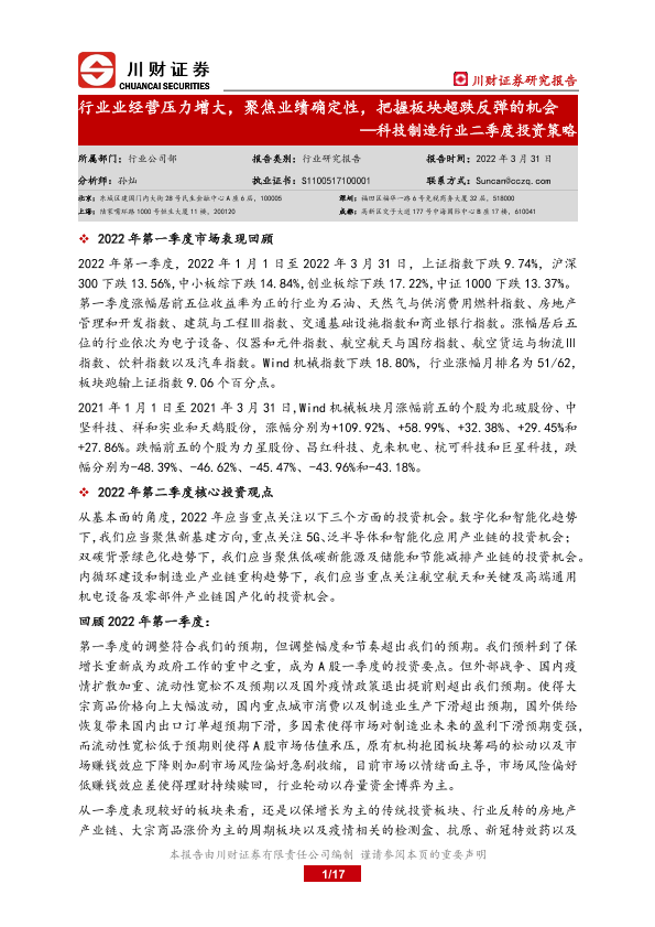 【川财证券】【20220331】科技制造行业二季度投资策略:行业业经营压力增大,聚焦业绩确定性,把握板块超跌反弹的机会-17页