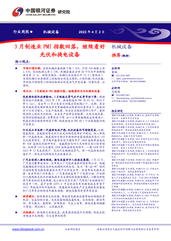 【银河证券】【20220402】20220402-中国银河-机械设备行业周报:3月制造业PMI指数回落,继续看好光伏和换电设备-21页