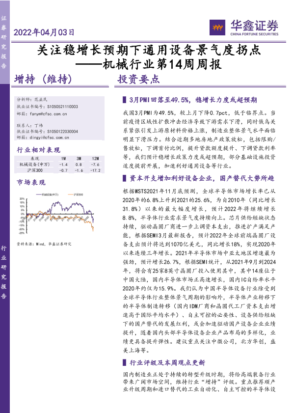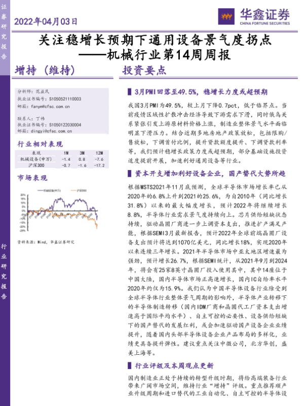 【华鑫证券】【20220403】20220403-华鑫证券-机械行业第14周周报:关注稳增长预期下通用设备景气度拐点-23页