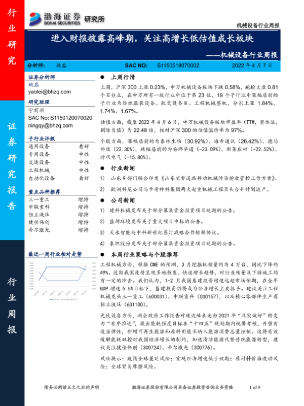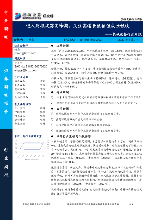 【渤海证券】【20220407】机械设备行业周报:进入财报披露高峰期,关注高增长低估值成长板块-9页
