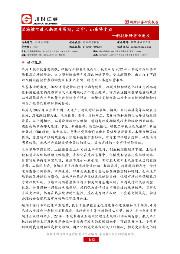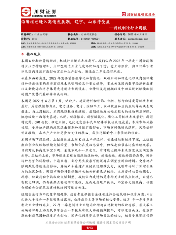 【川财证券】【20220408】20220408-川财证券-科技制造行业周报:沿海核电进入高速发展期,辽宁、山东将受益-13页