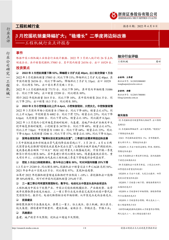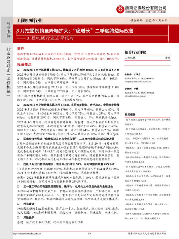 【浙商证券】【20220409】20220409-浙商证券-工程机械行业点评报告:3月挖掘机销量降幅扩大;“稳增长”二季度将边际改善-4页